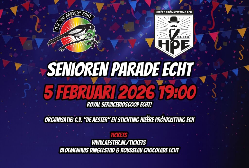 De Seniorenparade 2026 zal zeen op dónderdig 5 februari, begintj óm 19.00 oer en zal tót óngevieër 22.33 oer doere. En väör o.a. Veldeke geldtj ‘ne speciale pries! Het programma bestuitj oet de vertroewdje mix van gooj en bekèndje artieste wie: de Jónges van de Zank, ‘N Dance, Meister Martijn, Thei en Marij en ‘n buut van Har Daniëls. En daobie natuurlik Prins Rob I, Jeugdprins Max I en Jeugdprinses Jade mit hunne aanhank. Al mit al genóg óm ‘ne sjoane aovendj van te make.